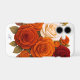 A stunning floral case showcasing rich autumn roses in shades of orange, red, and cream, arranged in a warm and elegant bouquet with a personalised monogram, classic and romantic.