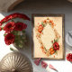 This gorgeous Spanish and Mediterranean influenced invitation features colourful, elegant, classic, sophisticated, and bold colours and light intricate natural frame details outlined with roses in muted but bright reds and oranges. The soft tarnish look of the papyrus paper background colour enhances the rustic and natural feel.