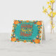 This Thanksgiving greeting card is a vibrant celebration of gratitude, featuring the heartwarming message, 'Grateful, Thankful, Blessed' in a lively, hand-drawn font. A deep teal background provides the perfect canvas for the pumpkin spice and sunflower yellow text to pop. The design is framed by a whimsical wreath of falling leaves and festive florals in a symphony of autumn's most beautiful hues. Two charming little turkeys, perched atop smiling pumpkins, add a playful touch. Personalise it with your family name and message for a unique and memorable way to share your blessings this season.