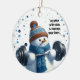A charming snowman lifts a hefty barbell outdoors on a snowy day, accompanied by a witty saying: "Snowmen work hard to maintain their shape." He's stylish in his toque and scarf on this ornament ready to adorn your tree.