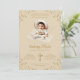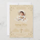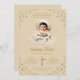 Celebrate your son's baptism with this charming Charro Boy Baptism Invitation featuring an adorable baby boy dressed in a traditional white and gold charro suit. The warm tan background, paired with ornate golden floral scrolls and a decorative cross, makes this design perfect for a classic Catholic bautizo with cultural elegance.