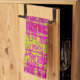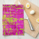 A richly textured abstract in shades of chartreuse, olive green, raspberry, pink, and fuchsia makes this an eye-catching kitchen towel.