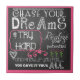 Chase Your Dreams Motivational chalkboard look ceramic tile with various font and text styles of white on a black chalkboard look background and a pink border. Text reads "Chase Your Dreams. Try Hard. Realise your potential and know...if you fail...you gave it your All"!