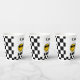 Simple one happy dude 1st birthday paper cup for a baby boy featuring a yellow face and black glasses, retro style text and black and white checkerboard pattern.