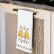 This funny cheese pun kitchen towel features the play on words phrase "cheddar together" with two kawaii style cheddar cheese wedges holding hands.