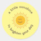 Cheerful yellow round sticker with the phrase "a little sunshine to brighten your day". Perfect for happy mail or small business packaging, sending encouragement or get well cards, particularly in cases where the diagnosis might be terminal. You can edit the text, if you wish.