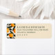 This return address label features a vibrant and elegant design with a beige background, adorned with a repeating pattern of illustrated oranges and green leaves on the left side. The right side showcases clean, centered text in a classic serif font, providing ample space for customization. The warm color palette, dominated by earthy tones, complements the botanical elements, creating a cheerful and sophisticated look perfect for personalizing invitations or announcements. The overall style is minimalistic yet lively, conveying a fresh and inviting atmosphere ideal for various occasions.