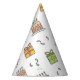 Colourful birthday theme pattern combining gift, cake and confetti elements.