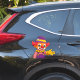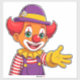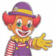 Vibrant cartoon clown with bright red hair, large green eyes and a wide smile. Wearing a purple hat with yellow band, yellow collar, and striped shirt, extending a friendly gesture.