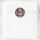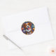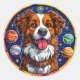 Cheerful dog with brown and white fur, prominently set against a vibrant background of outer space. The dog is centred in a circular frame decorated with colourful planets, stars, and other celestial elements. Its tongue is out, and it has a happy expression, giving it a playful personality. The combination of the dog and the cosmic theme creates a whimsical and imaginative atmosphere. The colours are bold and bright, enhancing the overall joyful vibe of the illustration.