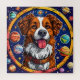Cheerful dog with brown and white fur, prominently set against a vibrant background of outer space. The dog is centred in a circular frame decorated with colourful planets, stars, and other celestial elements. Its tongue is out, and it has a happy expression, giving it a playful personality. The combination of the dog and the cosmic theme creates a whimsical and imaginative atmosphere. The colours are bold and bright, enhancing the overall joyful vibe of the illustration.