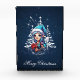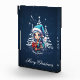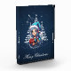 Cheerful elf who shines with her long, flowing blue hair. Her hair seems to shimmer in the soft light, giving her a magical glow. On her head she wears a cute blue Christmas hat decorated with a white pompom that matches her outfit perfectly. Her warm smile radiates joy and warmth, giving viewers a sense of festive anticipation. The background of the design features stylised white Christmas trees, and the sky is dotted with sparkling white stars that shine like little diamonds, creating a magical atmosphere.