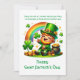 This vibrant Saint Patrick's Day greeting card features a cartoon-style leprechaun radiating joy and festivity. With his green hat and a shamrock, he stands against a backdrop of a colourful rainbow leading to a pot of gold. Perfect for capturing the spirit of Irish culture and celebration.