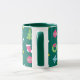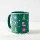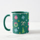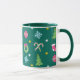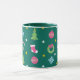 Christmas celebration pattern mugs with Christmas tree, ball, candy cane, snowflake, wreath, garland, and sock decoration ornament elements.