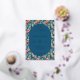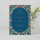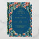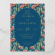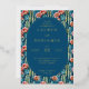 This wedding invitation features a vibrant and lively design with a central oval frame set against a backdrop of tall cacti and colorful flowers. The color palette includes deep navy blue, blues, greens, pinks, and corals, creating an inviting and cheerful atmosphere. The art technique is digital illustration, characterized by clean lines and flat colors that give it a modern yet organic feel. Elegant serif typography guides the reader through the event details, enhancing the overall sophisticated and whimsical style perfect for celebrating love and unity.