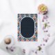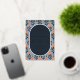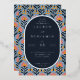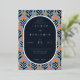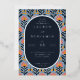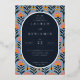 This wedding invitation features a modern and elegant design with a navy blue background adorned by a vibrant floral pattern in shades of coral, peach, and yellow. The layout is balanced and symmetrical, with an oval central text area framed by the playful floral motifs. Crisp serif typography adds a formal touch to the customisable placeholders for names, dates, and locations, while the cheerful colour palette creates a lively and inviting atmosphere perfect for celebrating love and unity.