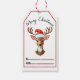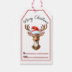 This festive Christmas tag showcases a joyful reindeer wearing a Santa hat, surrounded by holiday decorations. Perfect for adding a personal touch to gifts this season.