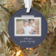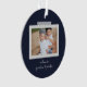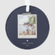 Cheerful sentiments snapshot ornament. Features, 2 framed photos with scrapbook style washi tape accents, 3 template text lines for your message, names and year with heart detail in white on navy blue colour backgrounds.
