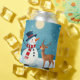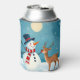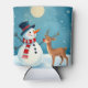 A happy snowman with a red scarf and a friendly reindeer stand amidst snowy trees and falling snowflakes, illuminated by a glowing wintery moon. A festive scene evoking warmth and joy.