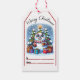 A delightful Christmas tag showcases a snowman holding a warm drink beside festive trees, with colourful presents and twinkling snowflakes creating a joyful holiday spirit.