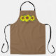 Apron features three happy Sunflowers with the scripture, "Rejoice in the Lord Always; Again I say Rejoice," from Philippians on brown apron. Sunflowers are a contour drawing. 3 styles of apron to choose from.