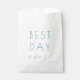 This wedding favor bag features a minimalist and elegant design with the phrase "BEST DAY ever" in bold, refined typography. The soft teal color palette against a white background creates a calming and sophisticated look, perfect for celebrating special occasions. The combination of structured sans-serif and flowing cursive fonts adds dynamic balance, while ample negative space ensures a clean and uncluttered appearance. Ideal for weddings or significant events, this design conveys a cheerful and optimistic mood, making it a timeless choice for memorable moments.
