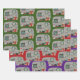Adorable little retro camper travel trailers, decorated with festive holiday wreaths, poinsettias, boughs of holly, and colourful wrapped gifts. There are sweet laced curtains in the windows. This trio of gift wrapping papers includes three different background colours, pine tree green, berry red, and