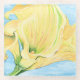 This vibrant original acrylic Calla Lily painting features bright yellows, spring greens, hints of hot pink and tangerine orange with a sky blue background. Brighten your coffee table with coasters that bring a joyful vibe to your living space with uplifting, whimsical art featuring yellow Calla Lilies and spring blue sky.