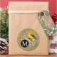 A cute, cheery, bright yellow bird perches on a twig embellished with stylised swirls and leaves on a light brown background in this naturalistic illustration. Personalise the black circle beside the warbler with a white monogram. Makes a unique outdoorsy gift for birdwatchers, nature lovers, hikers and outdoorsmen!