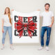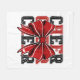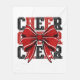 Fleece blanket is shown in a white colour with a black and red cheer bow print.