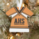 Cheerleader outfit ornament in black, white and orange with varsity letters on front that you can change to match your high school and cheerleader's name, date and additional text back. Simply change the background colour from black, white and orange to black, white and any other colour to match your team.