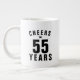 Cheers to 55 years! 55th Birthday jumbo coffee mug gift for him or her. Fun quote drinkware for fifty five year old men and women. Change age year accordingly. Add your own custom number. Cool surprise Birthday party gift idea for legendary dad, mum, mother, father, husband, wife, aunt, uncle, grandpa, grandma, brother, sister, grandma, grandfather, stepfather, pensioner, stepdad, retired person, pensioner, boss, co worker, colleague, friend, family member etc. Black and white extra large cup with big letters. Age specific humour / Over the hill joke for fiftyfive year old. Fun template for fifty fith Birthday celebration. Personalizable number for 30th 40th 50th 60th 70th 80th Bday! Nice for home or office. Very big oversized XL 20oz cup size. Biggest on Zazzle. Double sided print.