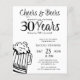 Informal and funny cheers and beers budget affordable men thirty birthday party invitation card with a fancy typography script, a doodle beer mug, and vintage style swirls. +++++++++++++ Suitable for any age or milestone adult birthday party. Easy to personalise by changing age, name and party details!