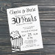 Informal and funny cheers and beers men thirty birthday party invitation card with a fancy typography script, a doodle beer mug and vintage style swirls. +++++++++++++ Suitable for any age or milestone birthday party. Easy to personalise by changing age, name and party details!