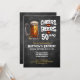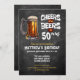 A mix of rustic and midcentury modern style birthday invitation, with a dash of modern grunge. A "Cheers and Beers" theme with a big beer stein glass, and two toasting beer steins on the back side. The text is customisable.
