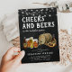 Rustic bachelor party invitations featuring a chalkboard effect background, a selection of watercolor beers, pretzel, and a beer barrel, string lights, and a modern "cheers and beers" party template that is easy to personalise.