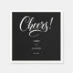 "Make a stylish statement at your celebration with these 'Cheers!' Elegant Script Black Wedding Napkins. Featuring a lively 'Cheers!' in graceful white script on a sleek black background, along with your personalised names and event date, these napkins are perfect for adding a touch of modern sophistication to any occasion. The striking contrast offers a chic and memorable accent for formal wedding receptions, engagement parties, anniversaries, or New Year's Eve gatherings. Customise with your own details to create a truly unique and joyful addition to your event decor."
