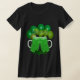 Cheers to being 21 t-shirt to customise on both front and back. Black shirt (with more options) with Irish celebration design. Green balloons are the backdrop for your text. Sample wording is, "Cheers to 21" in shadow text. Two large mugs of green beer and green clovers are also part of the design. On the back, text is "Birthday Girl" in black with green shadow, and a single green balloon. Perfect for celebrating a March, or St. Patrick's Day birthday!