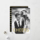 Celebrate the New Year with your friends and family by sending them a modern New Year's photo card. The stylish photo card features the word "Cheer" in a faux gold foil font and placeholders for text and a photo. The back of the card features a black background with faux gold foil hand drawn stripes. The black colour can be changed to a colour of your choice with the Customise It tool.