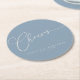 Cheers Minimalist Script Custom Wedding Round Paper Coaster in Dusty Blue