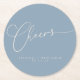 Cheers Minimal Dusty Blue Script Custom Wedding Round Paper Coaster