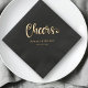 Elegant wedding foil napkins with the text "cheers" in a calligraphy script font and the couple's names and wedding date below. Real foil text on a black background.
