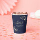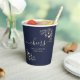 Celebrate in style with these elegant navy blue wedding paper cups featuring the word cheers in flowing gold calligraphy. Adorned with vintage floral illustrations, these cups add a romantic and sophisticated touch to your cocktail hour, reception, or signature drink station.