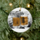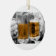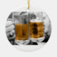 Photograph of two mugs of beer being held against each other. Beer in mug colourized; remaining photo is black and white. Shown in round ornament; other styles available. Background colour of your choice. Customisable.