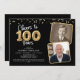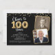 Cheers to 100 Years 2 Photos Script Gold Balloon Numbers Black Party Invitation. Celebrate a 100th birthday with these elegant and festive party invitations featuring the title CHEERS TO 100 YEARS with faux metallic gold balloon numbers and confetti, modern script typography and 2 photos with your choice of background colour (shown in black). ASSISTANCE: For help with design modification or personalisation, transferring the design to another product or if you would like coordinating items, contact the designer BEFORE ordering via Zazzle Chat or email makeitaboutyoustore@gmail.com.
