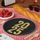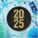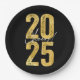 Stylish Cheers to 2025 White Handwriting Script Calligraphy and Bold Faux Gold Foil Typography on Black Modern New Year's Eve Party Paper Plate.