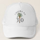 A bright white Cheers to 30 trucker hat for the woman turning thirty — think sunshine and palm trees. This customizable tropical birthday party gift coordinates with a matching invitation and other party supplies. Featuring a lush palm tree motif in the center bordered on each side with the birthday age that you can personalize with any age desired. Say Hello 30 in tropical style!