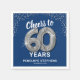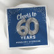 Elegant sixtieth birthday party napkins featuring a stylish blue background that can be changed to any colour, silver sparkly glitter, the saying "cheers to 60 years" using sixty silver hellium balloons, their name, and the date of the celebration.