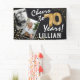 Celebrating the BIG 70! This birthday party banner allow you to upload a before and after photograph of the birthday man or woman, with the title 'Cheers to 70 Years!' and their name. Featuring a rustic chalkboard background, gold number seventy helium balloons and faux gold glitter confetti.