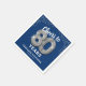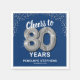 Elegant eightieth birthday party napkins featuring a stylish blue background that can be changed to any colour, silver sparkly glitter, the saying "cheers to 80 years" using eighty silver hellium balloons, their name, and the date of the celebration.